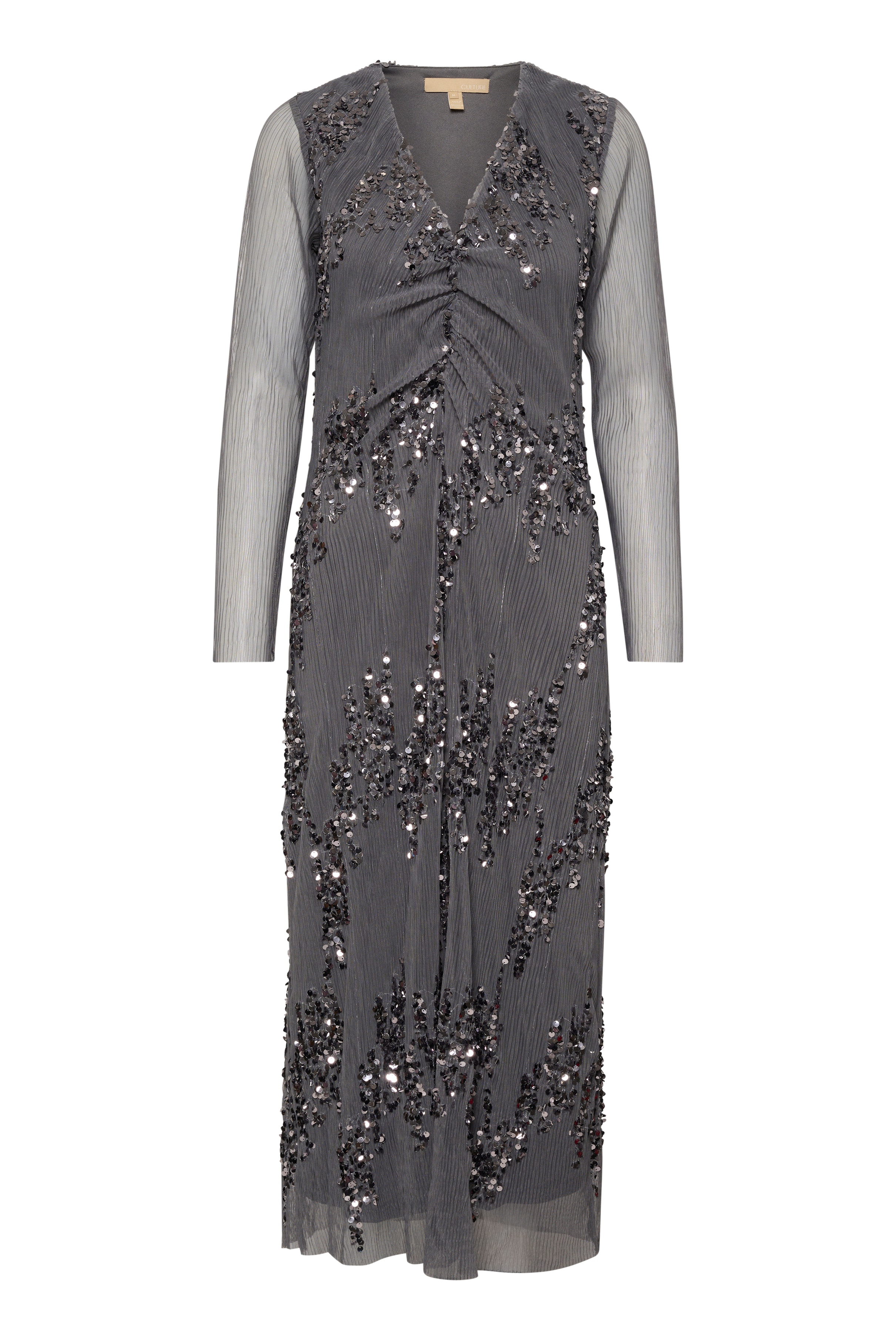 Midi-jurk met rechte pasvorm, diepe V-hals met plooidetail, transparante lange mouwen en all-over glinsterende pailletten voor een opvallende look.