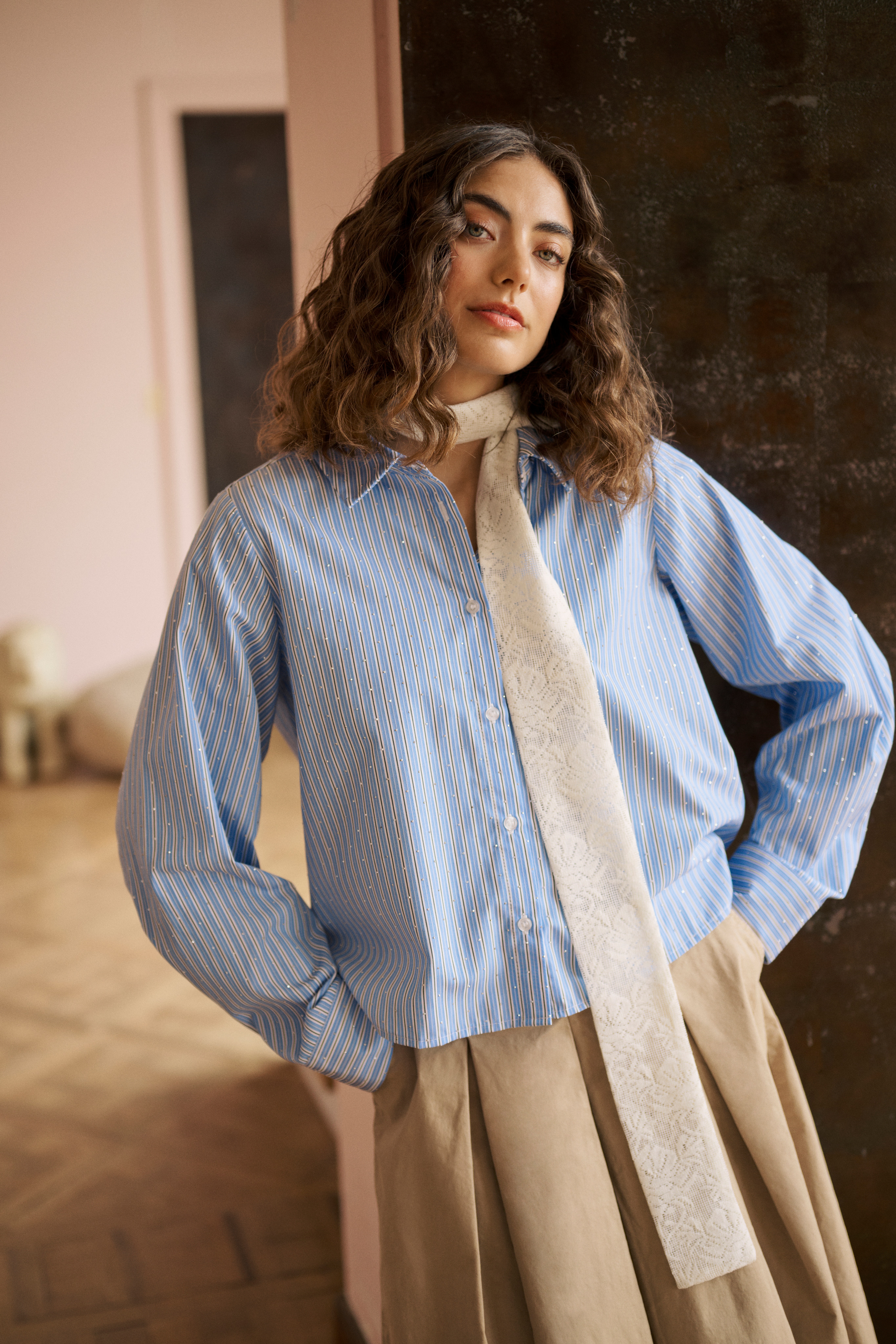 Deze A-lijn rok heeft plooien aan de voorkant en een elastische tailleband aan de achterkant voor een comfortabele en flexibele pasvorm. Het model is 175 cm lang en draagt maat 38.