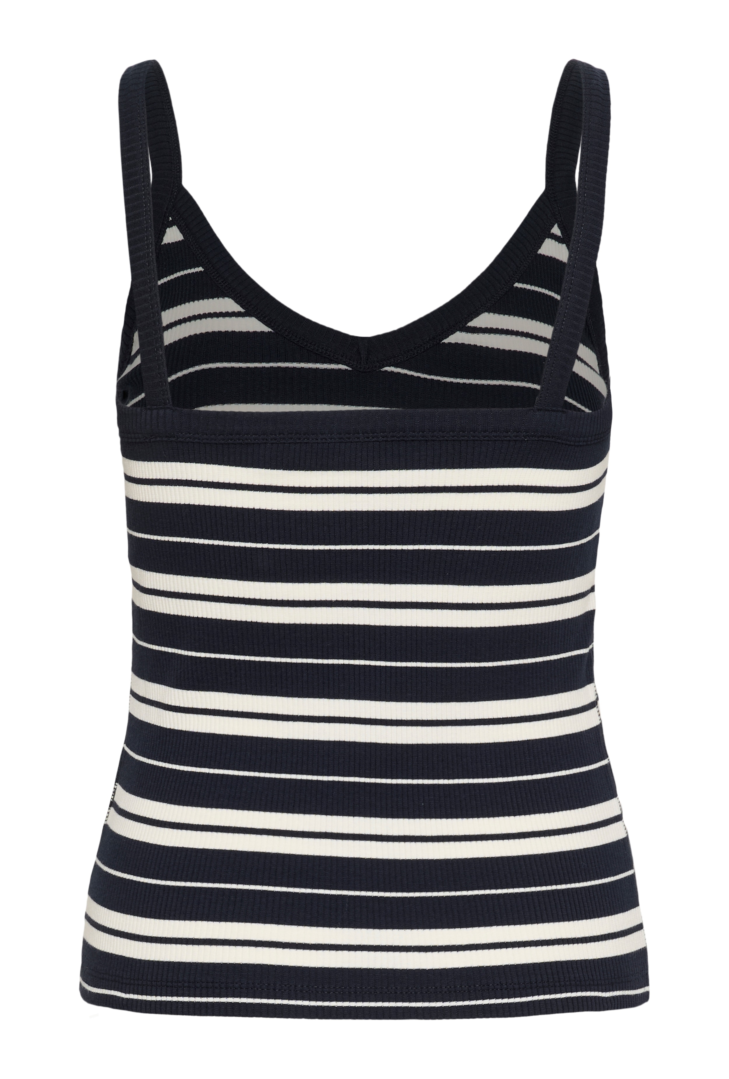 Geribbelde tanktop met brede bandjes en V-hals. Uitgevoerd in donkerblauw met zandkleurige strepen en ajourdetails bij de hals. Gemaakt van een zachte katoenmix met een aangesloten pasvorm. Het model is 176 cm lang en draagt maat 36/S.