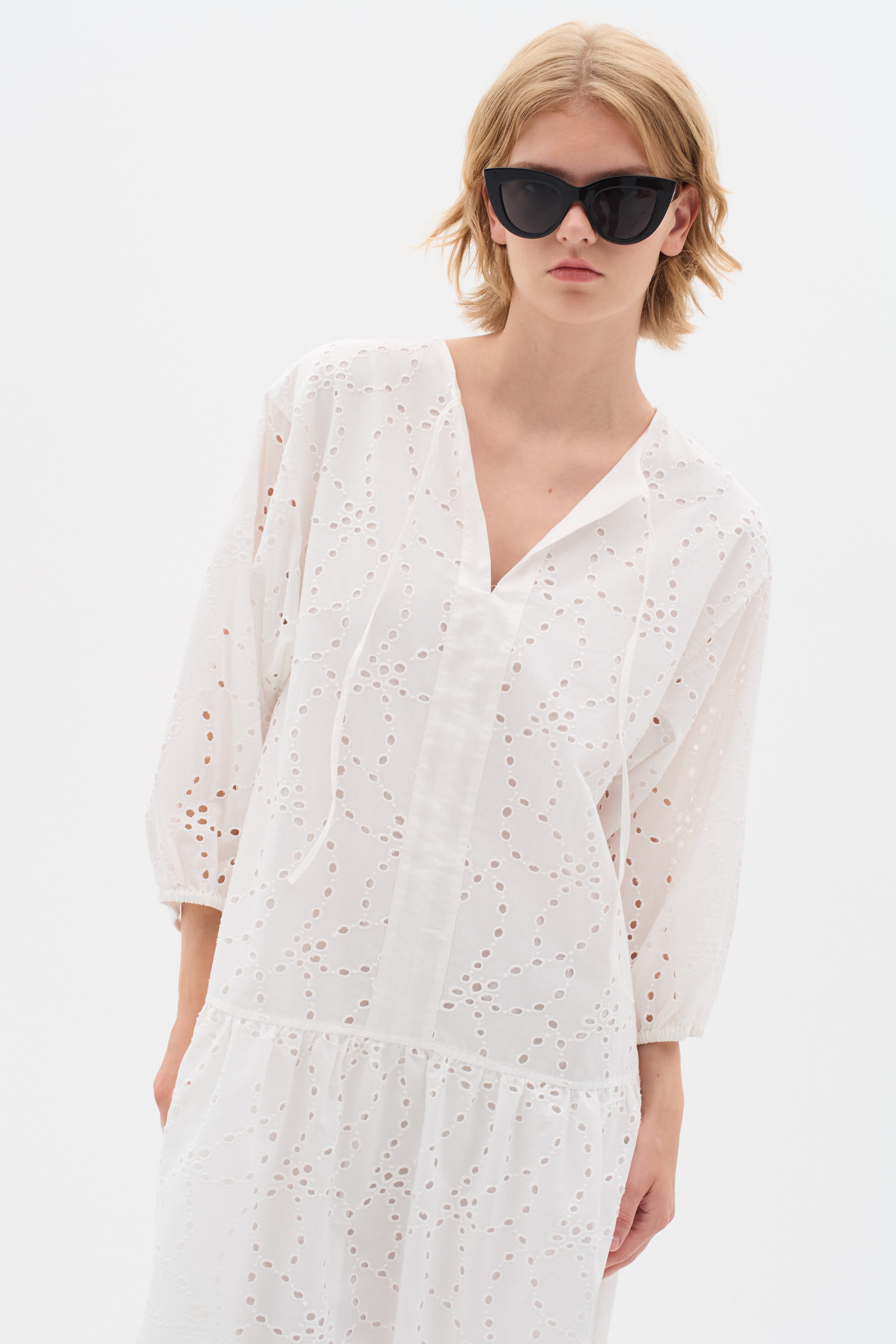 Witte jurk in licht katoenen broderie met driekwartsmouwen en V-hals. Het model heeft een ontspannen pasvorm met taille-accent en een wijd uitlopend rokgedeelte voor een vrouwelijke, luchtige look. Comfortabel op warme dagen. Het model is 176 cm lang en draagt maat 36/S.