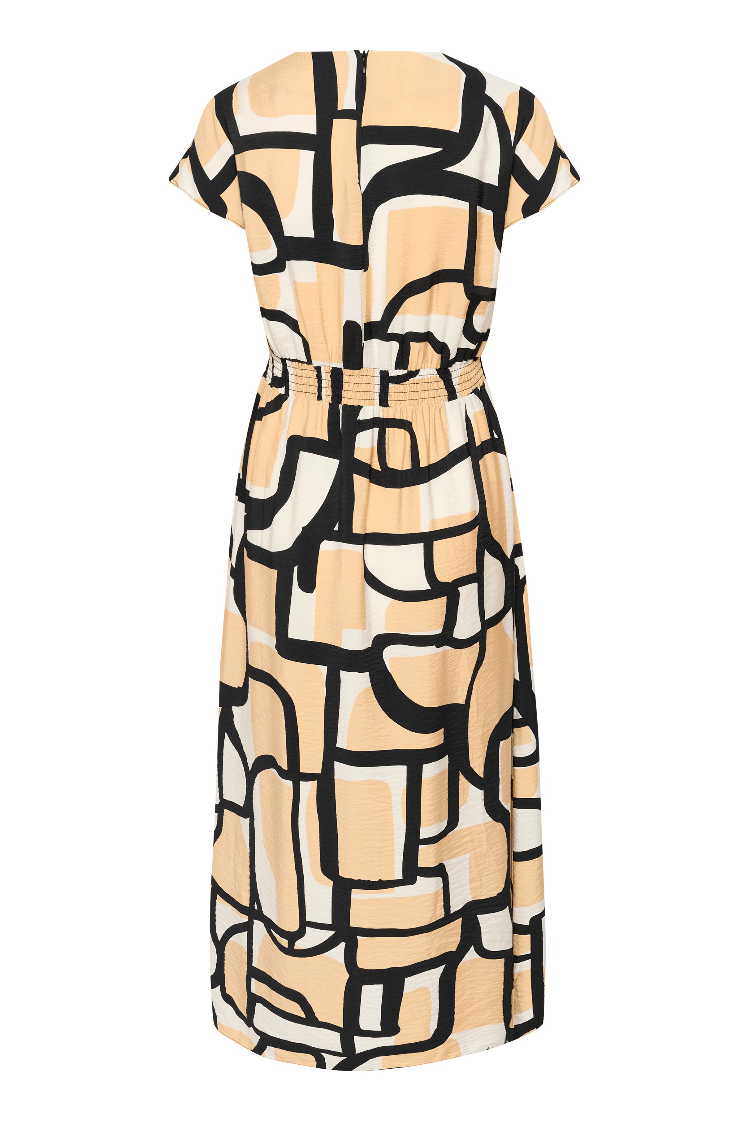 Jurk met een grafisch patroon, korte mouwen, een ronde halsuitsnijding, korte mouwen en elastiek aan de achterkant, wat een elegante silhouet creëert. Het model is 177 cm lang en draagt maat 36/S.