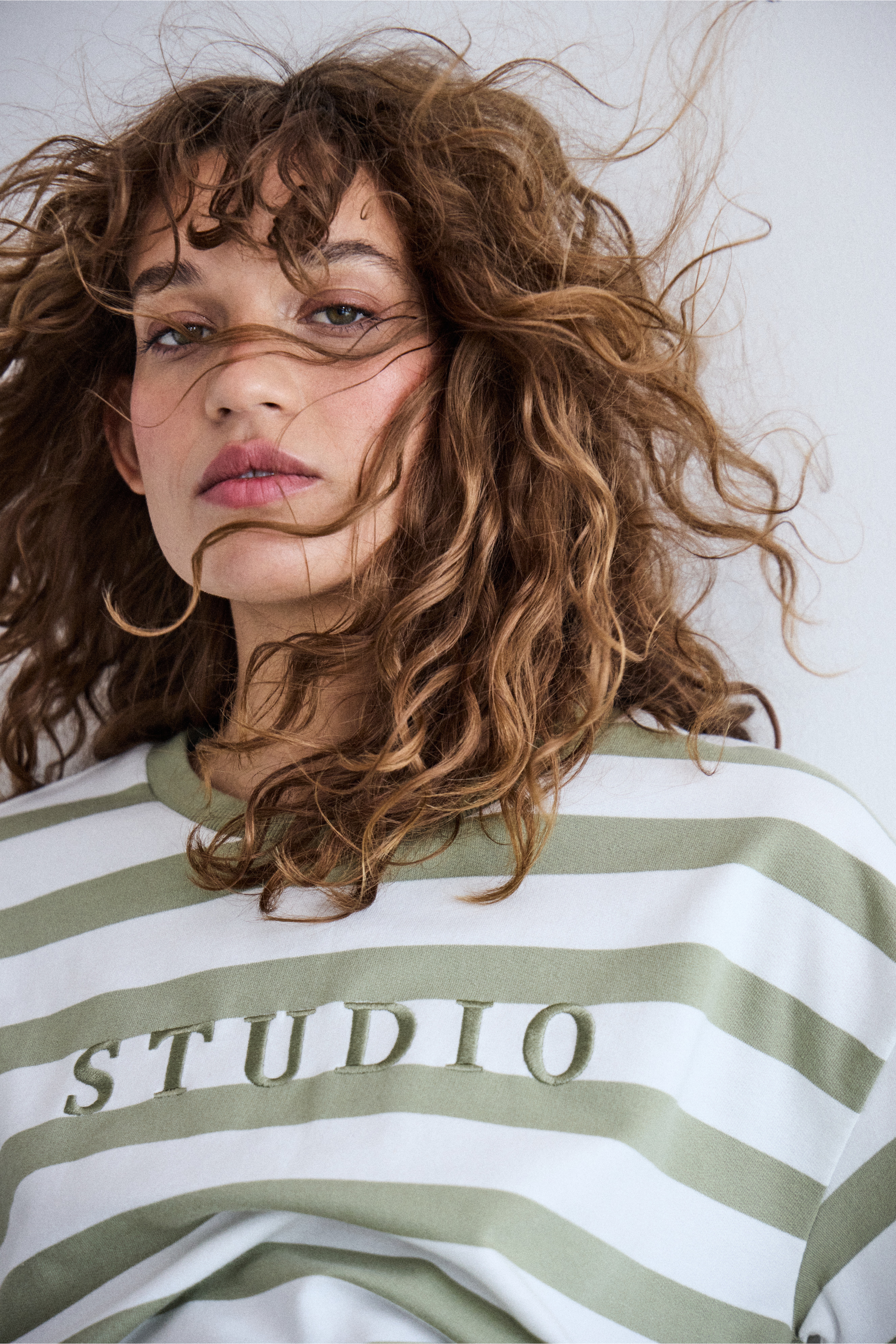 Boxy gestreept T-shirt met opvallende "STUDIO" tekst. Voorzien van een ronde hals en brede, verlaagde korte mouwen voor een eigentijdse look.