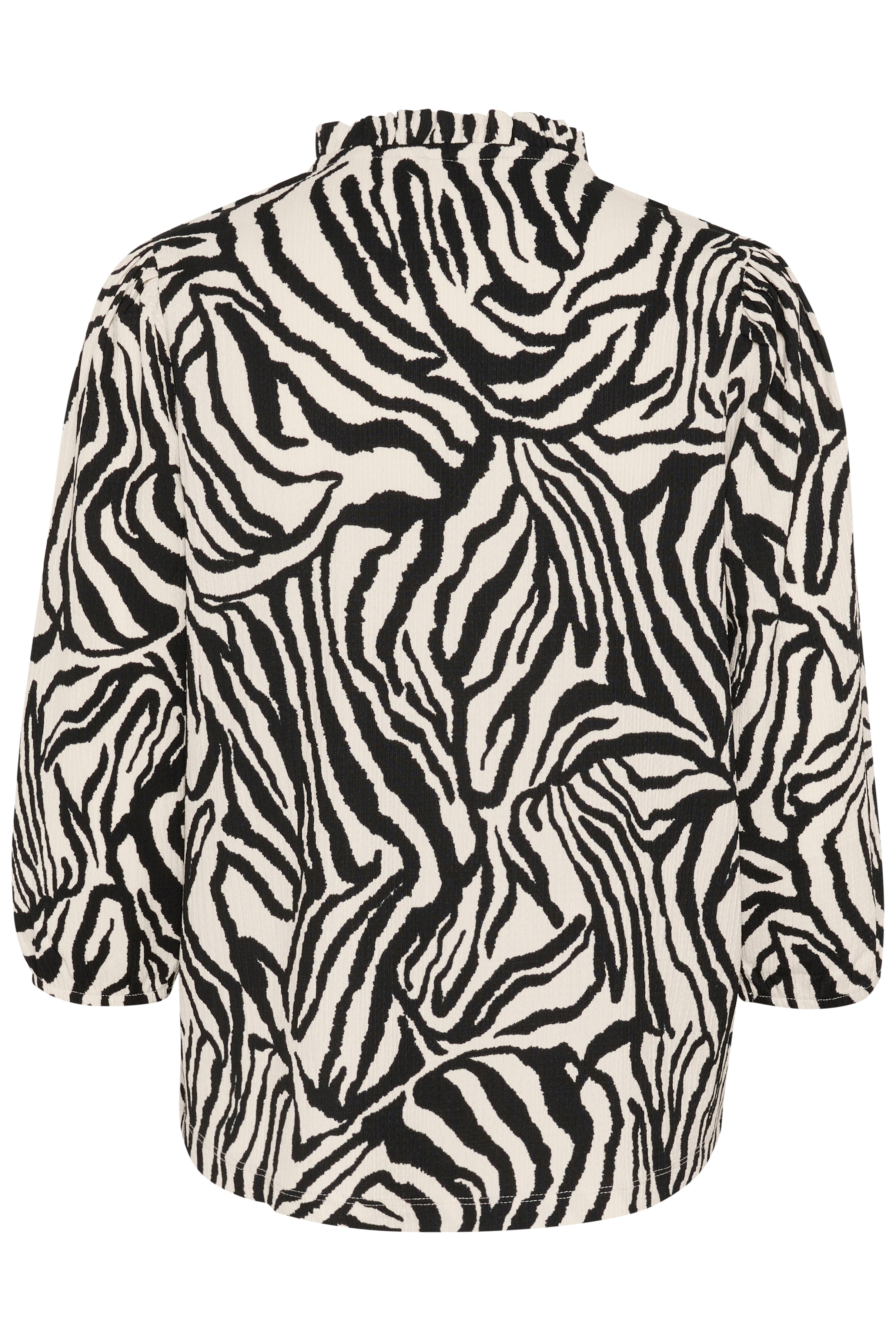 Modern blouse met rechte pasvorm, driekwartsmouwen en een zacht textuur. Voorzien van een subtiele gerimpelde kraag en V-hals.