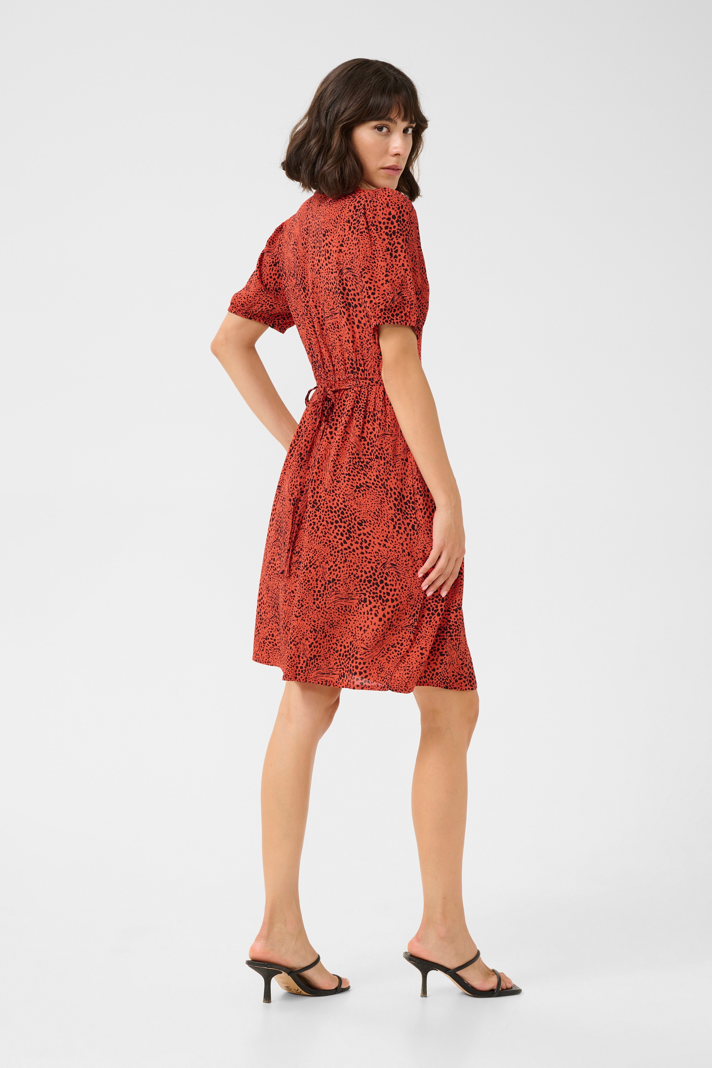 Korte jurk met V-hals en knopen, lichte textuur. Korte pofmouwen en strikceintuur creëren een gedefinieerde pasvorm met rechte zoom.