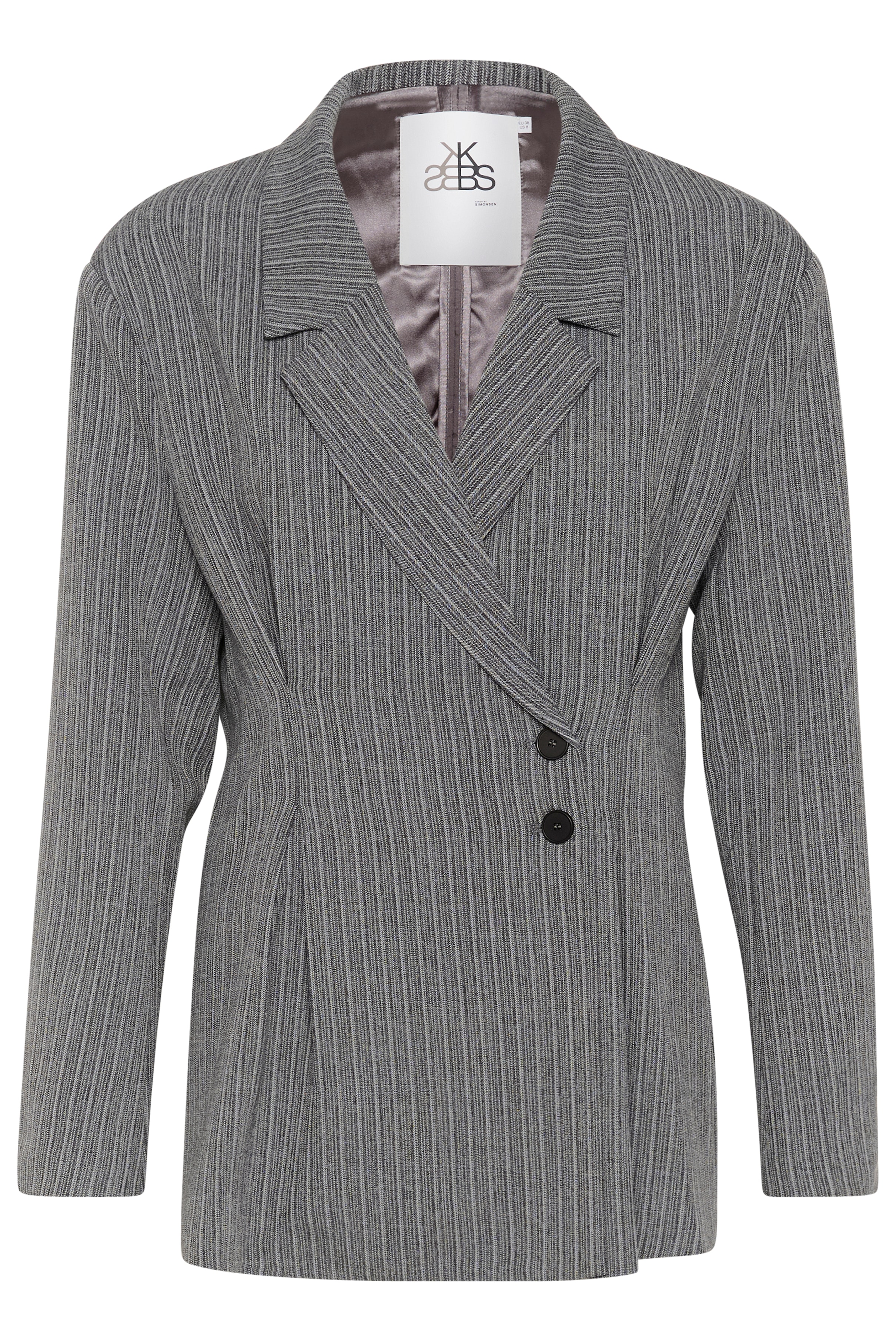 Gestreepte blazer met dubbele rij knopen, twee knopen vooraan, scherpe reverskraag en recht, relaxed silhouet tot over de heup.