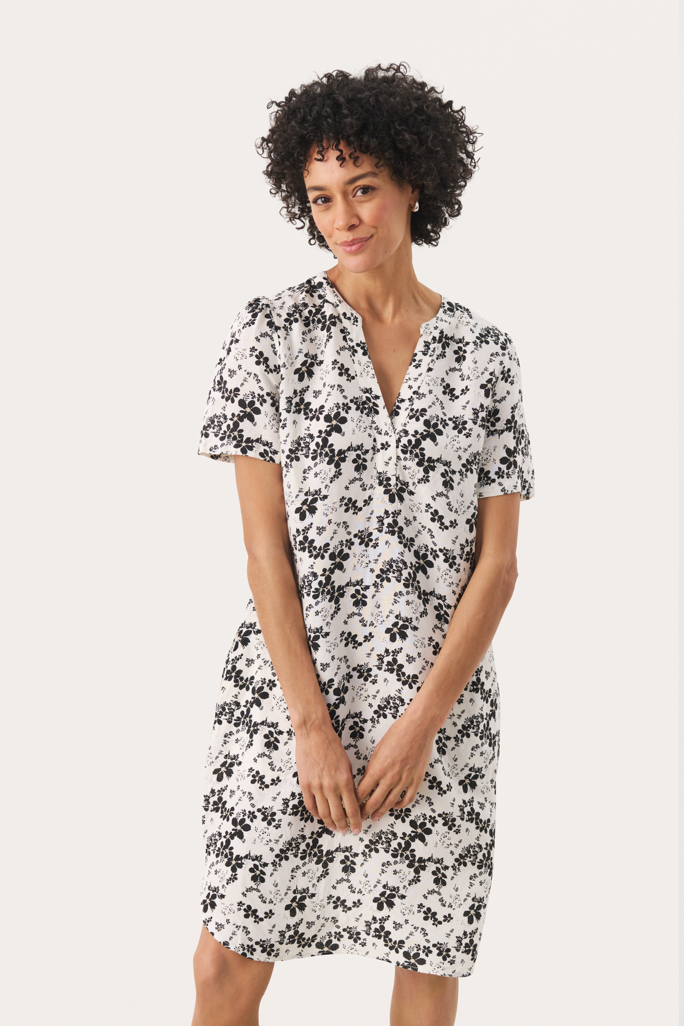 Modellen är 177 cm lång och bär storlek 36. Denna lätta klänning med svartvitt blommönster har korta ärmar, V-ringning och en avslappnad passform med rundad fåll. Det mjuka materialet gör den bekväm att bära – perfekt för varma dagar med sandaler eller sneakers för en enkel sommarstil.
