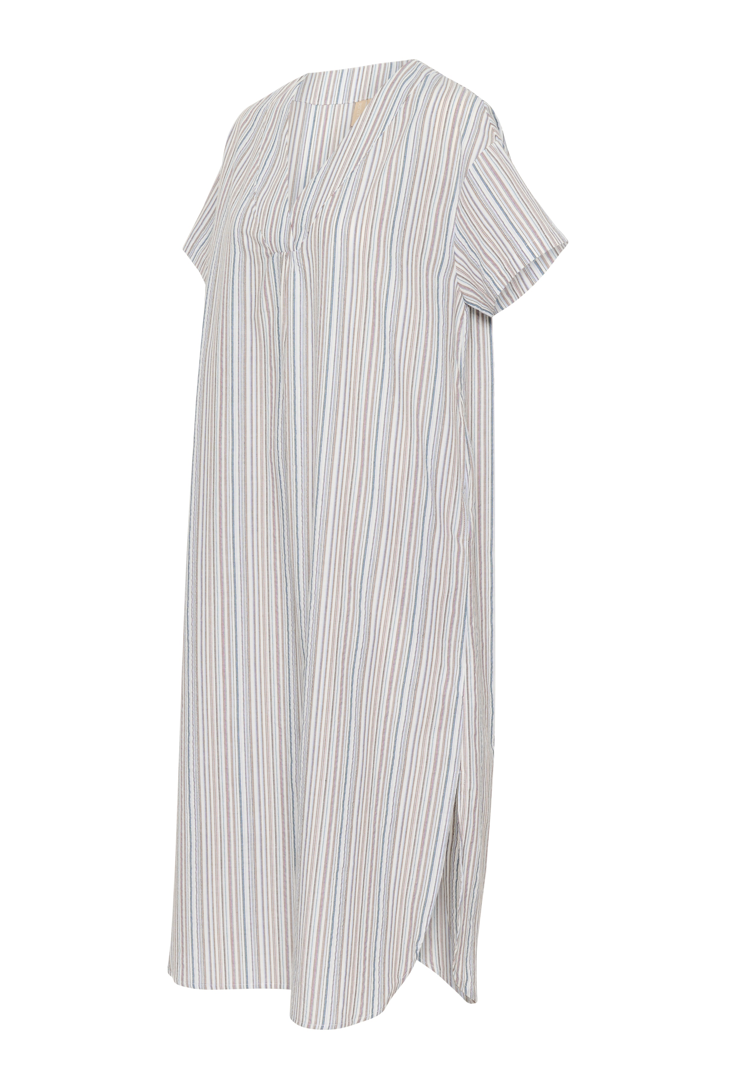 Ledig klänning med smala ränder i neutrala toner. Klänningen har V-ringning, korta ärmar och slitsar i sidorna. Det lätta materialet och avslappnade snittet gör den idealisk för varma sommardagar. Modellen är 177 cm lång och bär storlek M/38.