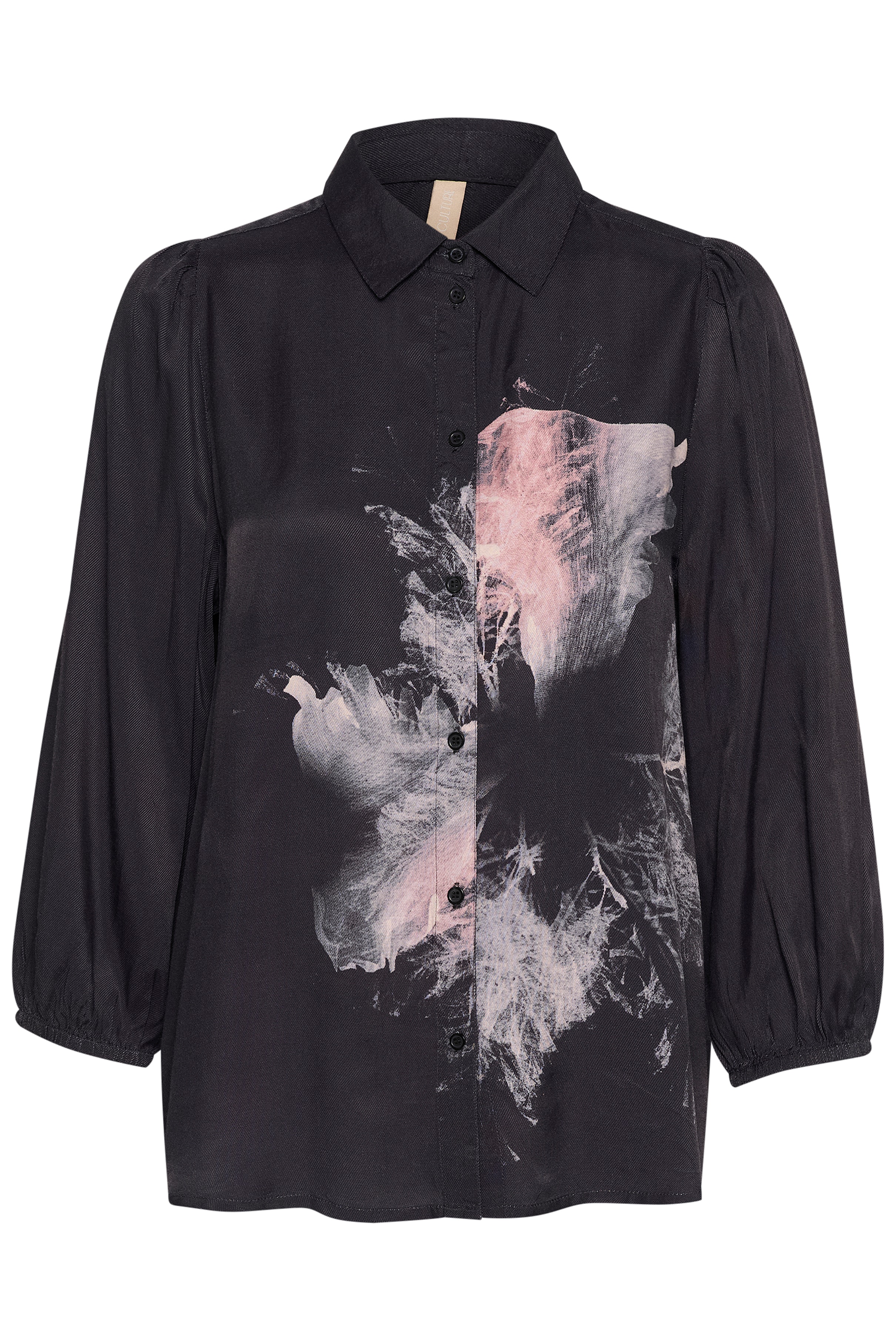 Skjorta med rak siluett, klassisk krage och luftiga 3/4-ballonärmar. Tunn, lätt transparent yta och tydlig abstrakt print framtill.