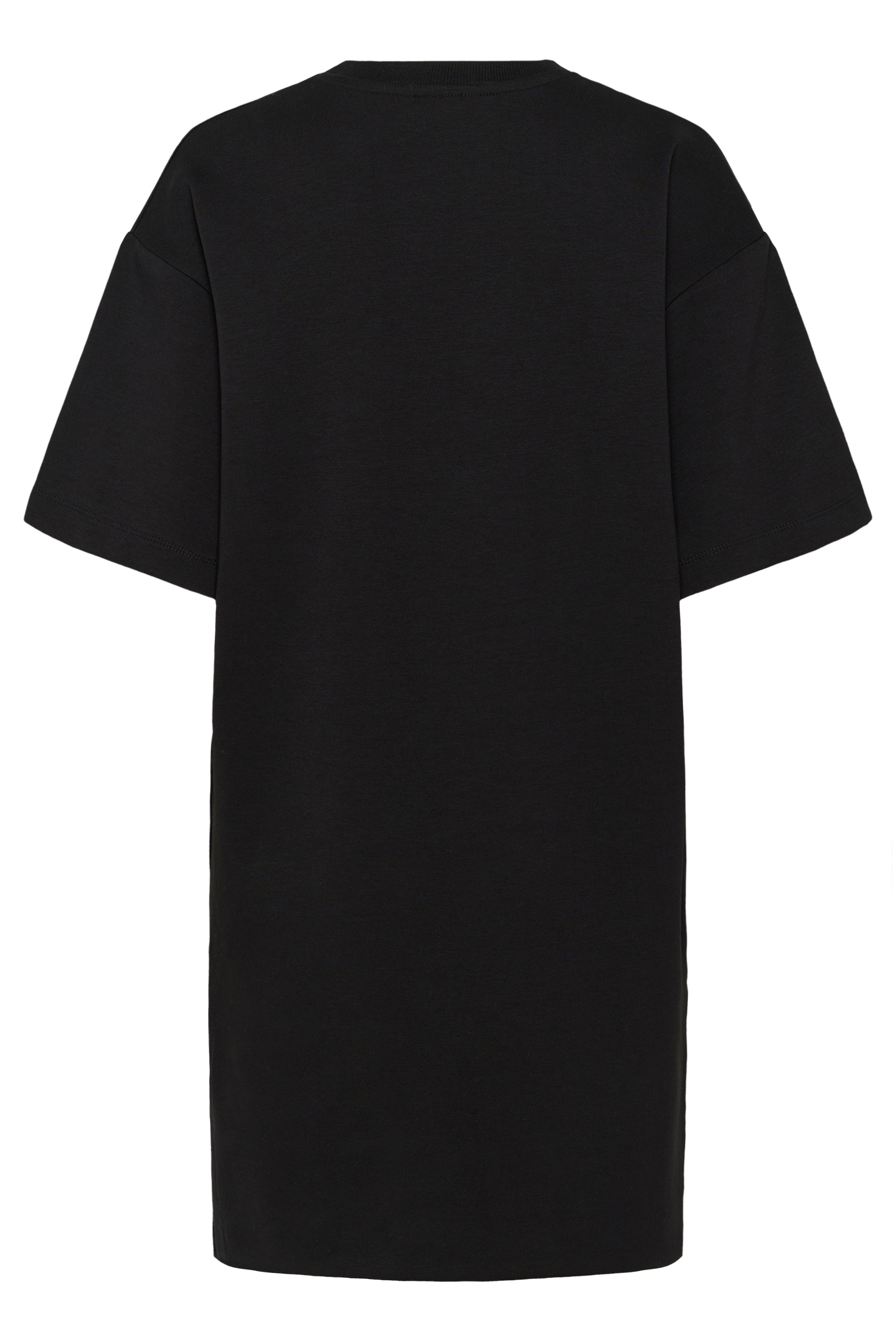 Oversized T-shirtklänning med rund halsringning och nedhasade axlar. Avslappnad passform med korta ärmar och minimalistisk logotyp framtill – idealisk för vardagligt bruk. Modellen är 176 cm lång och har på sig storlek S/36.