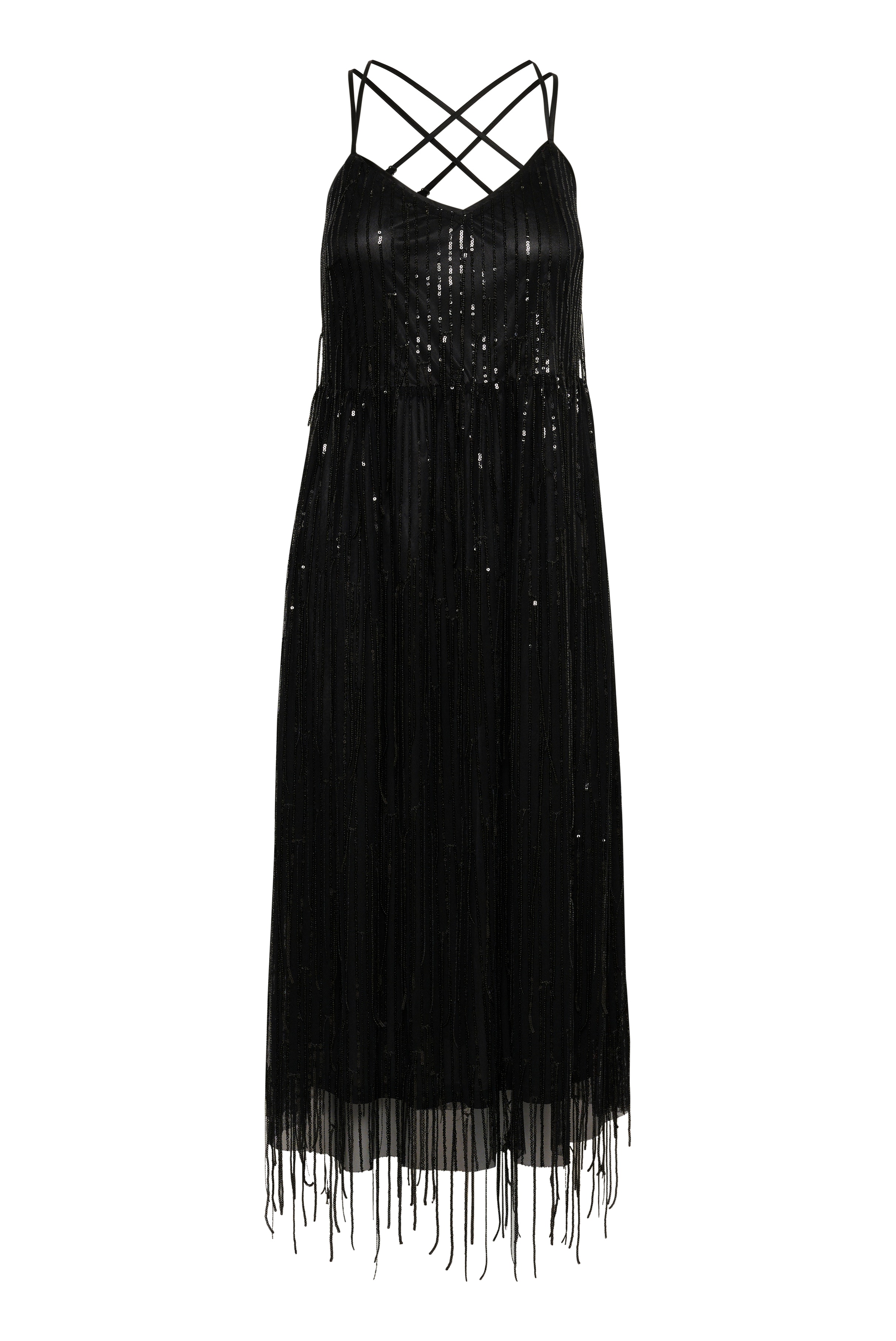 Denna glamorösa klänning har skimrande paljetter och fransdetaljer som ger extra rörelse och stil. De korsade spaghettibanden och den flödande silhuetten gör den perfekt för festliga evenemang och kvällstillfällen, och utstrålar elegans och glädje.