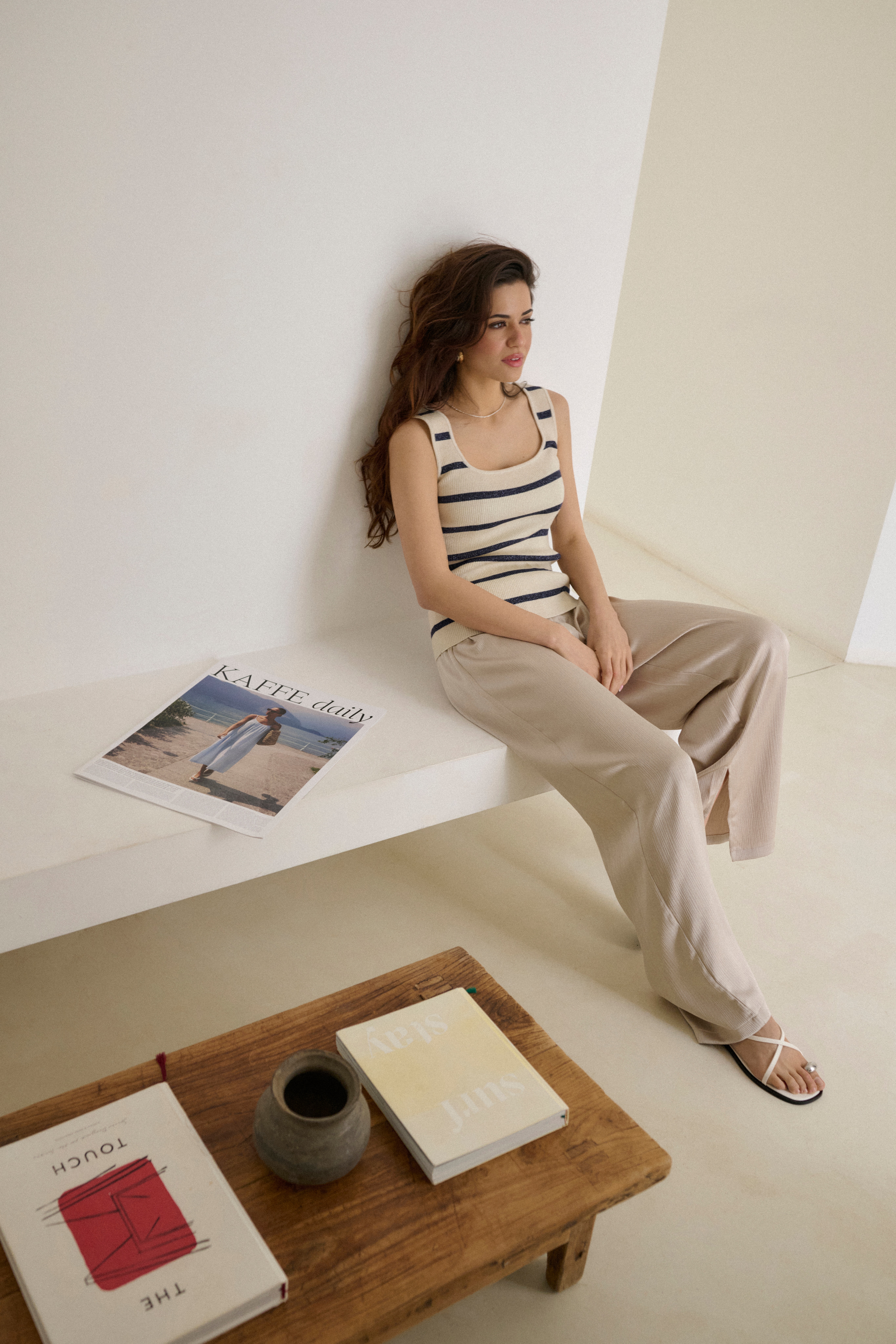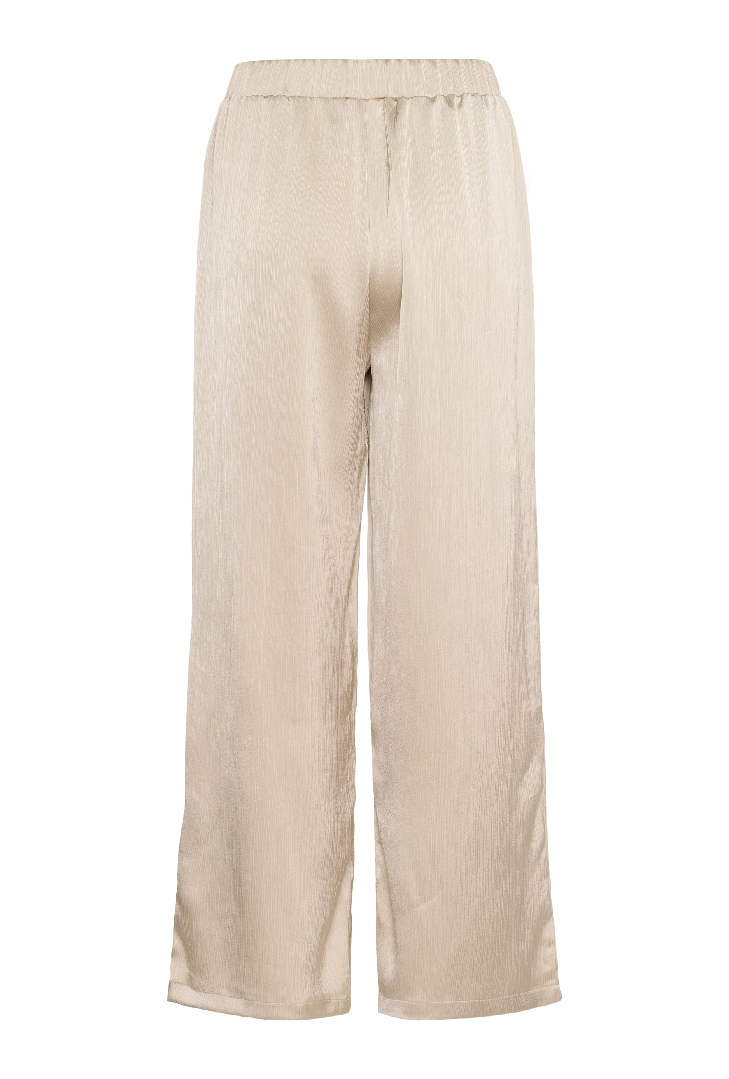 Vida byxor med mjuk, skimrande yta och elastisk midja. Dolda sidoslitsar skapar rörelse i det långa, minimalistiska snittet.