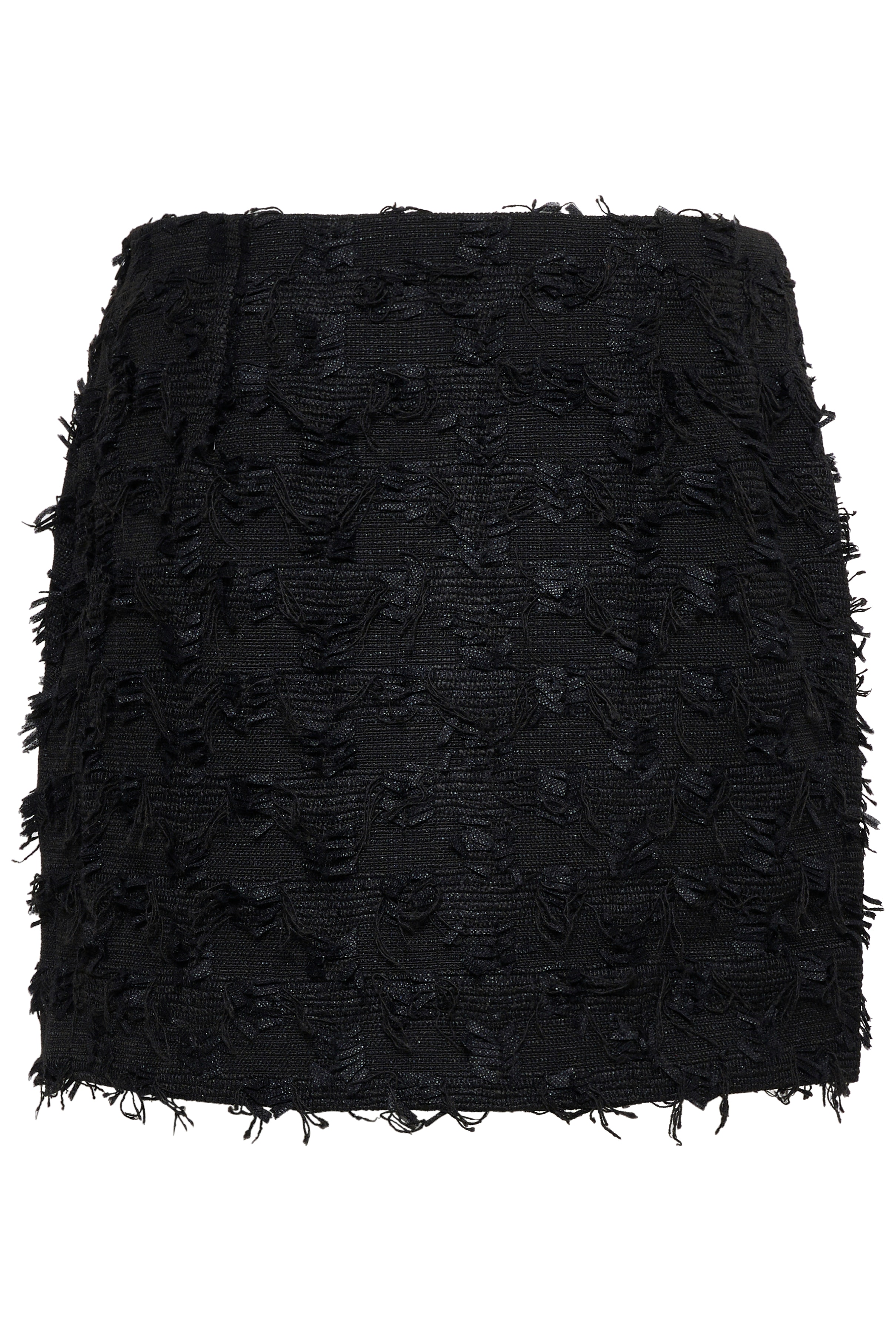 Denna minikjol har markerad struktur och fransad effekt över hela ytan. Rå kant nertill ger looken en tydlig, självsäker attityd.