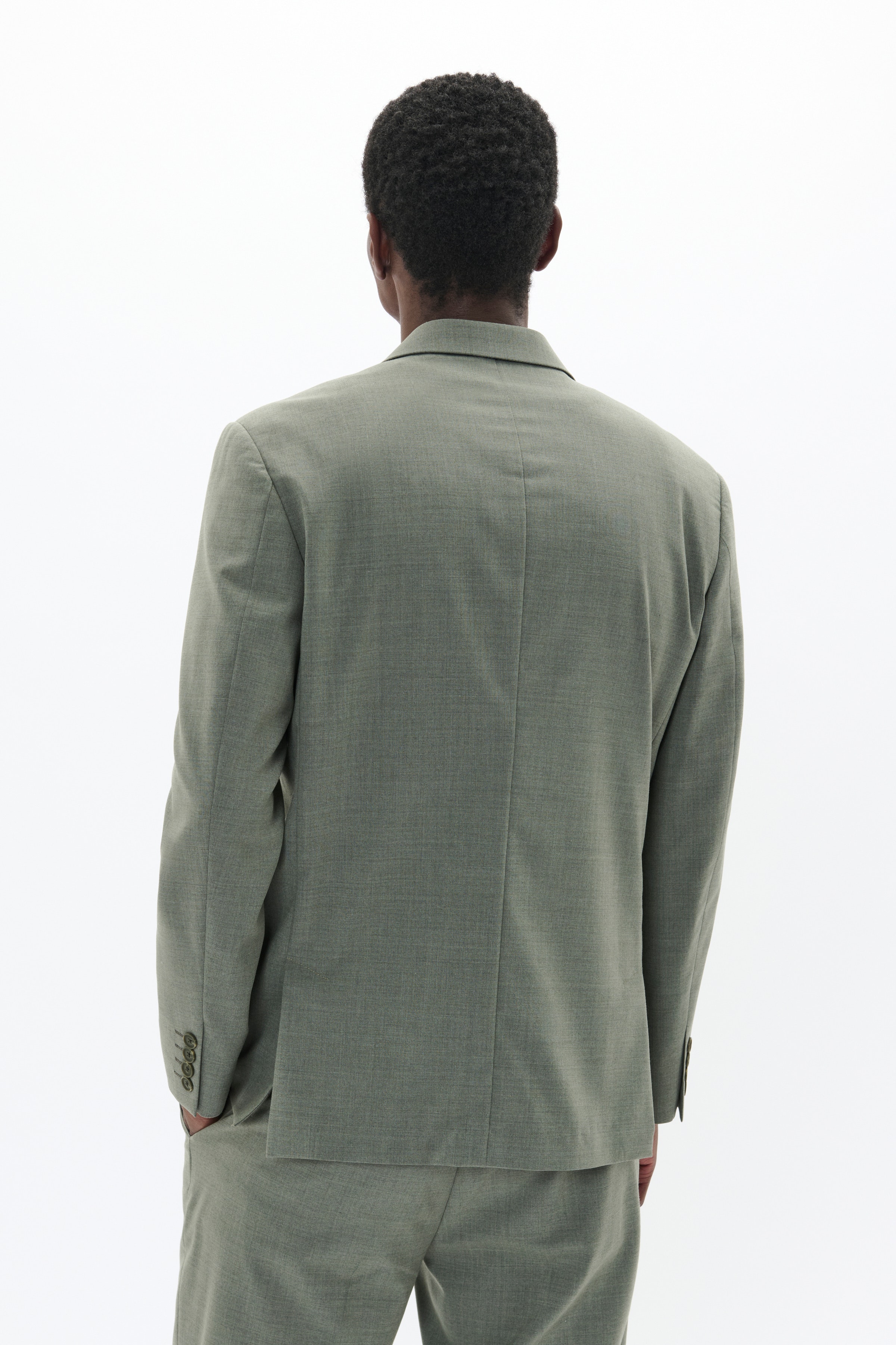 Dubbelknäppt kavaj med rak passform, spetsiga slag och hellånga ärmar. Städad känsla med utanpåfickor och slät yta för modern stil.