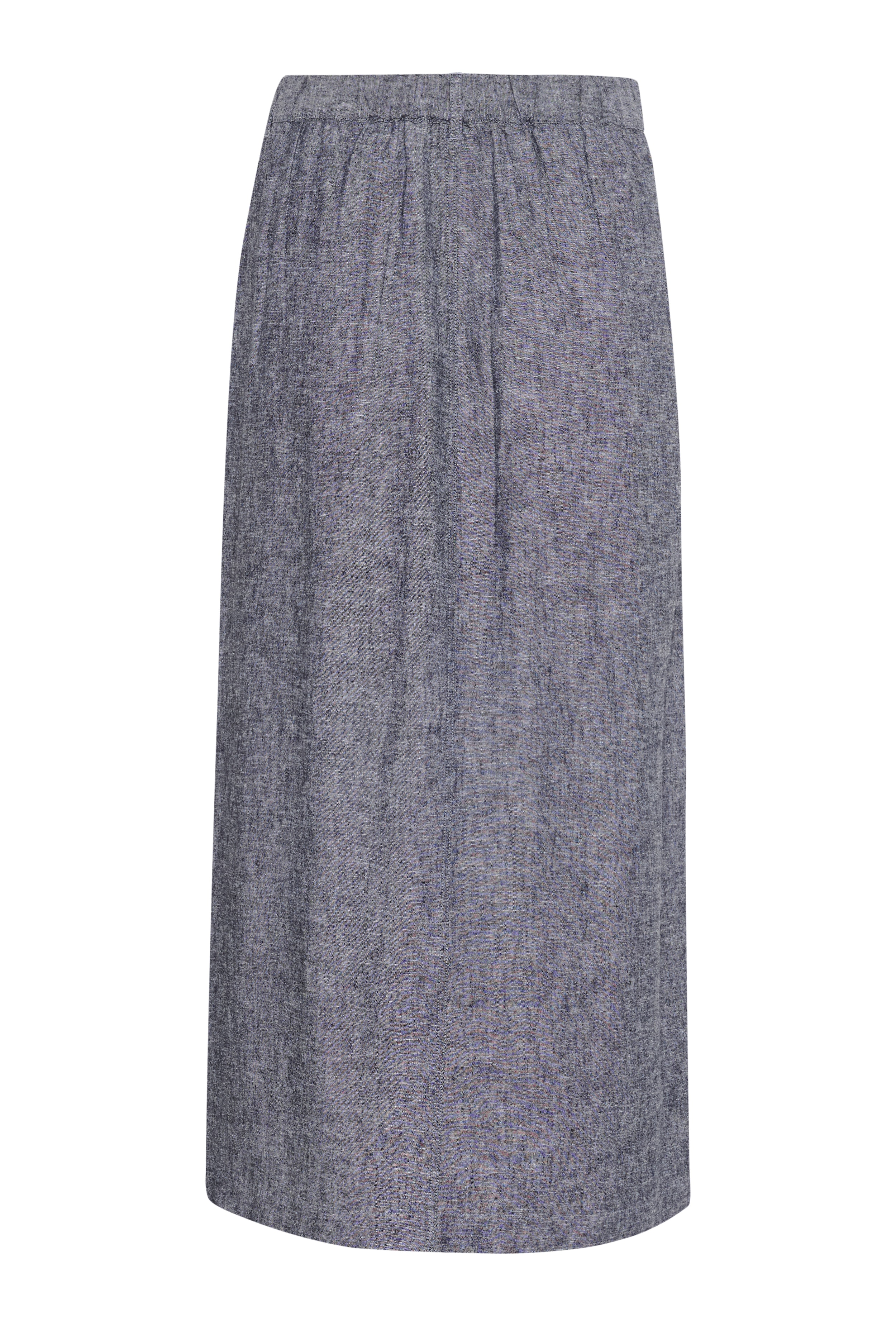 Lång kjol i en lätt linnemix med mörkblå och vita trådar i melerad effekt. Modellen har fast linning, sidfickor, slits i sidan och stängs med knapp framtill. En tidlös siluett med avslappnat och modernt uttryck. Modellen är 176 cm lång och bär storlek 36/S.