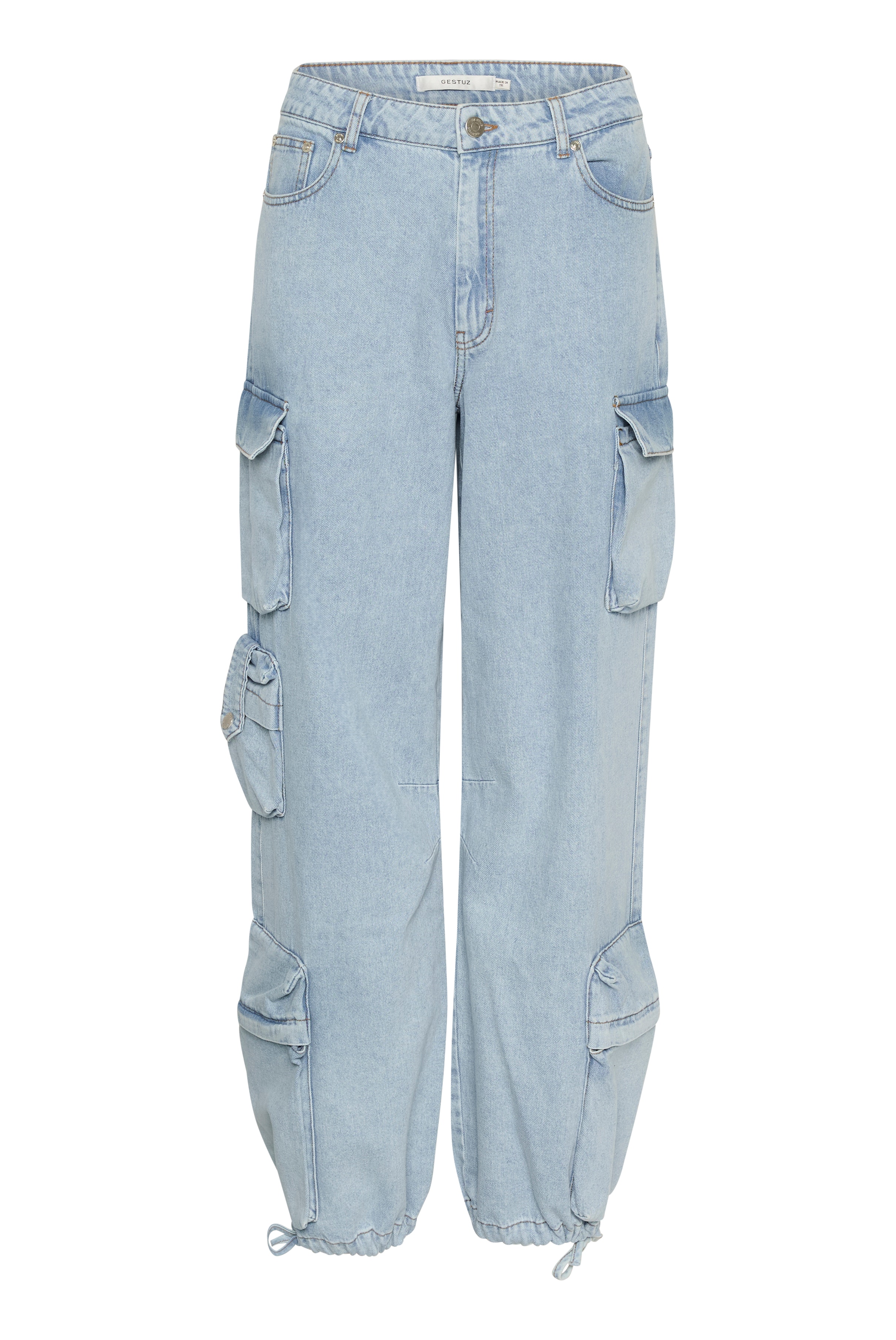 We hate to wait on the pieces we fall in love with on the runway. So, we created an exclusive collection of see-now buy-now pieces shown on the AW24 catwalk for Copenhagen Fashion Week, and available to shop right away. Oversize and loose fitted denim cargo pants in a light wash. The pants has a mid waist and large pockets at each leg with string details. The pants can be worn with a straight leg at the bottom or tied to emphasize the loose fitted legs. Style the pants with the matching Vinny shirt for a full denim look or with the Drew logo top for a casual look.